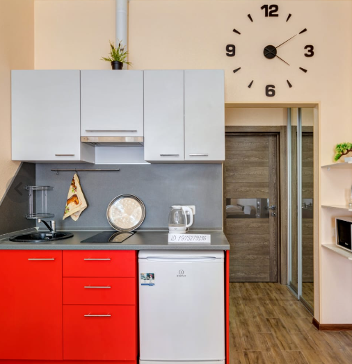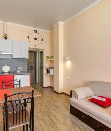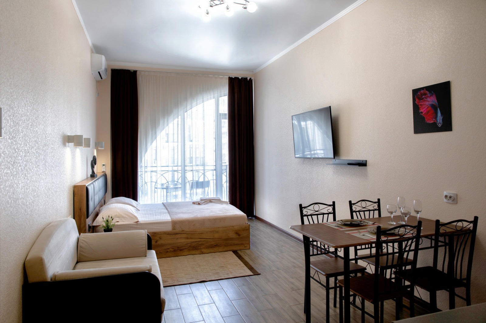 Просторная студия площадью 28 квадратных метров находится на втором этаже, к которому ведёт пассажирский лифт. В интерьере продумано каждое решение — здесь с комфортом разместятся от трёх до четырёх гостей. Основное спальное место — большая двухспальная кровать размером 160 на 200 сантиметров, дополнительное — раскладной диван-кровать 140 на 180 сантиметров. Все спальные зоны оснащены качественным постельным бельём и матрасами, обеспечивающими глубокий и отдохновительный сон. Пространство оформлено в светлых тонах, создавая ощущение свежести и простора.