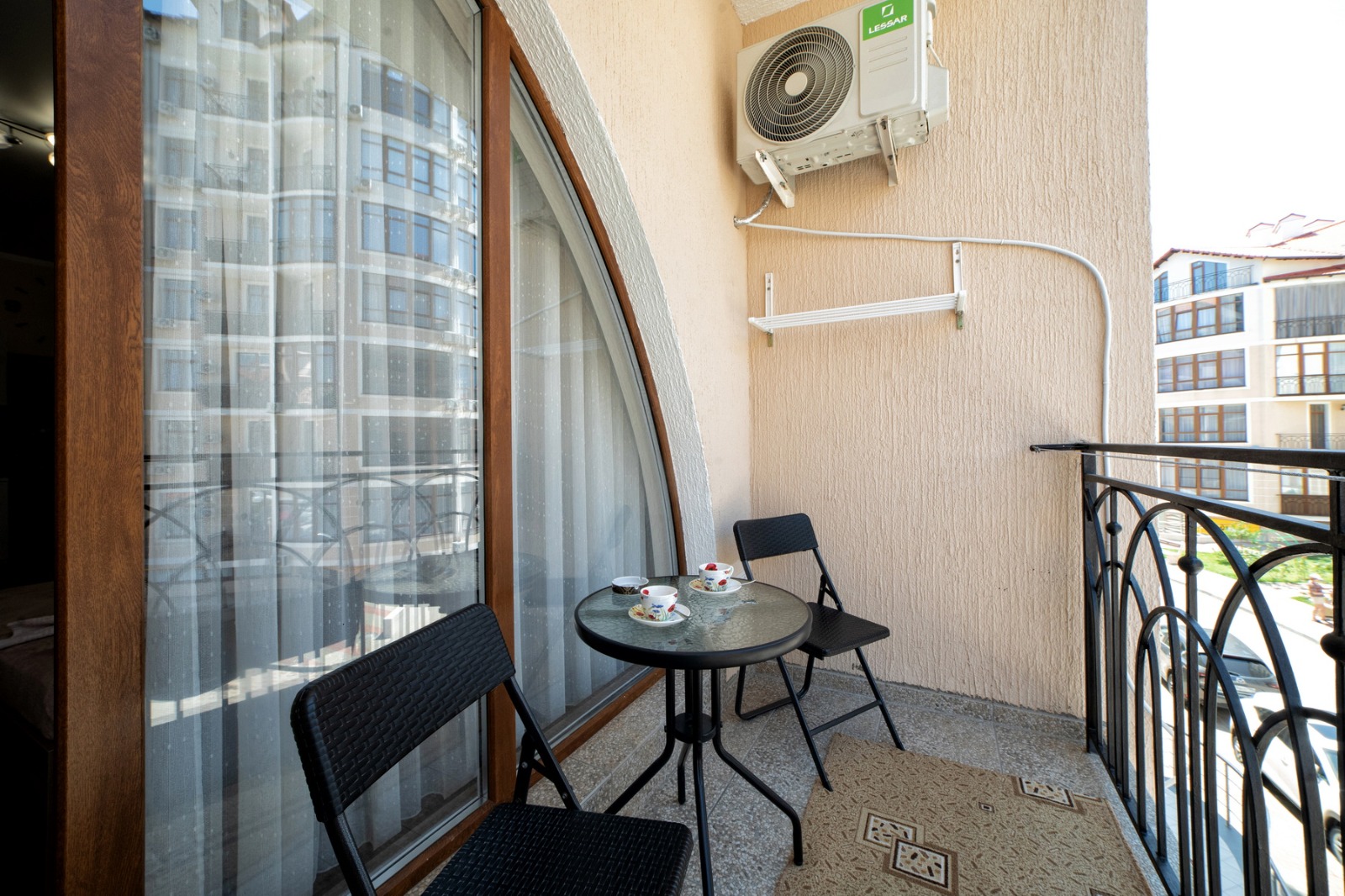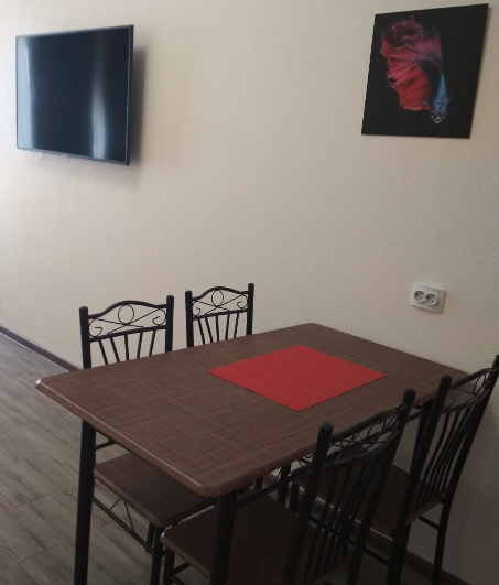 Для поддержания комфортной температуры в любое время года установлена современная сплит-система. На стене расположен телевизор с большим плоским экраном диагональю 140 сантиметров — идеальный выбор для вечерних фильмов или просмотра любимых передач. Гостям предоставляется стабильный Wi-Fi, чтобы можно было оставаться на связи, работать или делиться впечатлениями в соцсетях. Балкон с сушилкой для белья выходит в сторону комплекса и добавляет удобства при длительном проживании. Здесь можно выйти с чашкой кофе утром и насладиться тишиной перед началом дня.