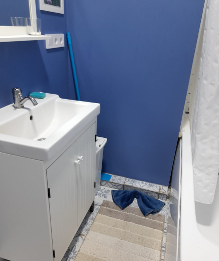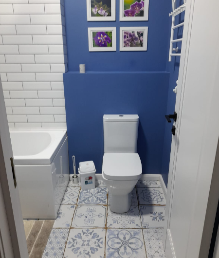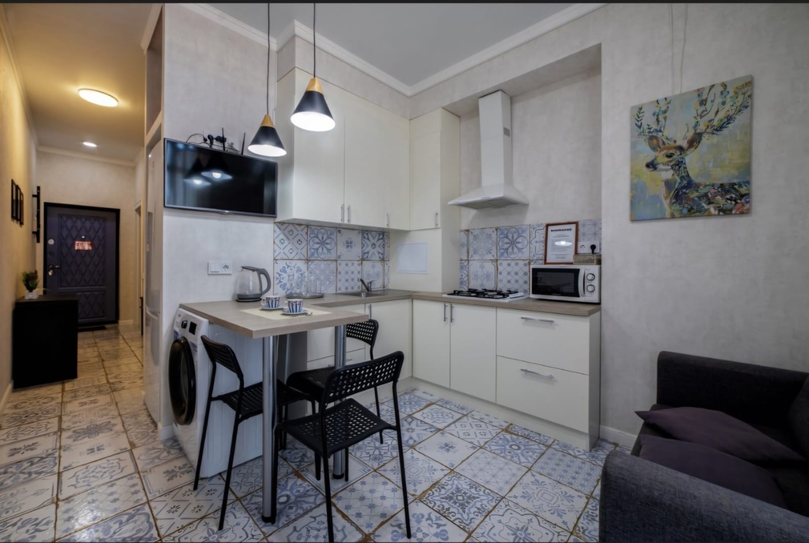 Ванная комната оборудована ванной, стиральной машиной, феном и полотенцами. Утюг и гладильная доска помогут быстро привести одежду в порядок перед выходом. Кухня полностью укомплектована для самостоятельного приготовления еды. Здесь есть газовая плита, холодильник, электрический чайник и микроволновая печь. Обеденный стол на три персоны и стулья создают уютную атмосферу для приёмов пищи.