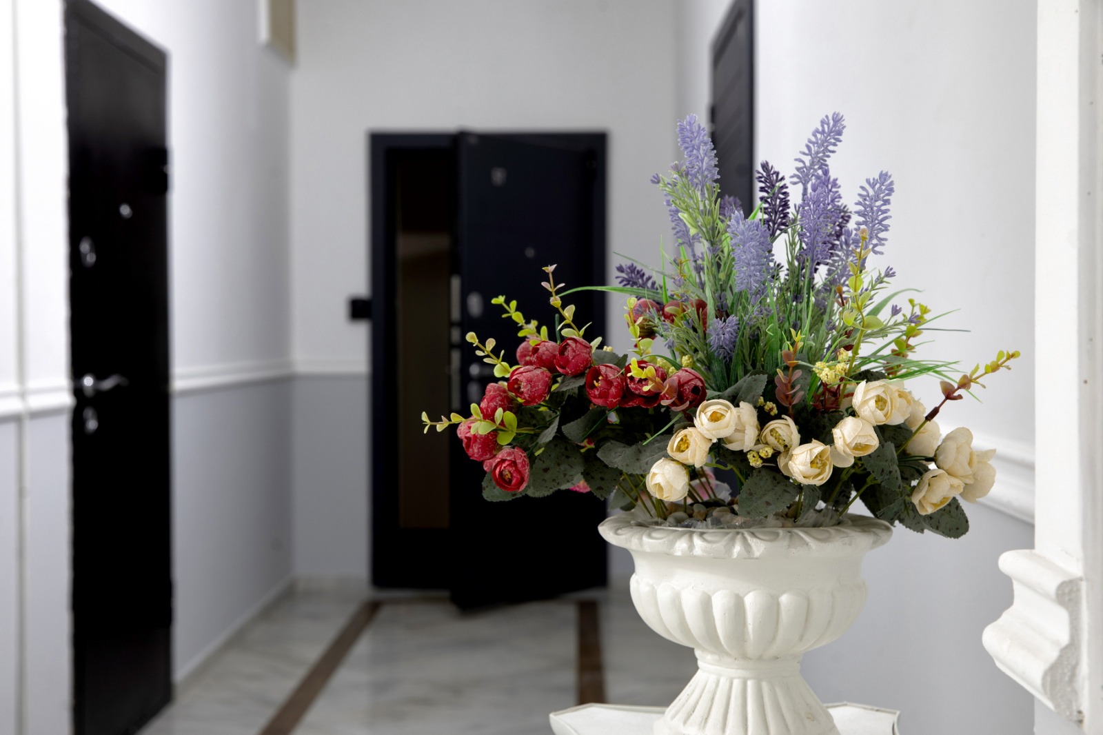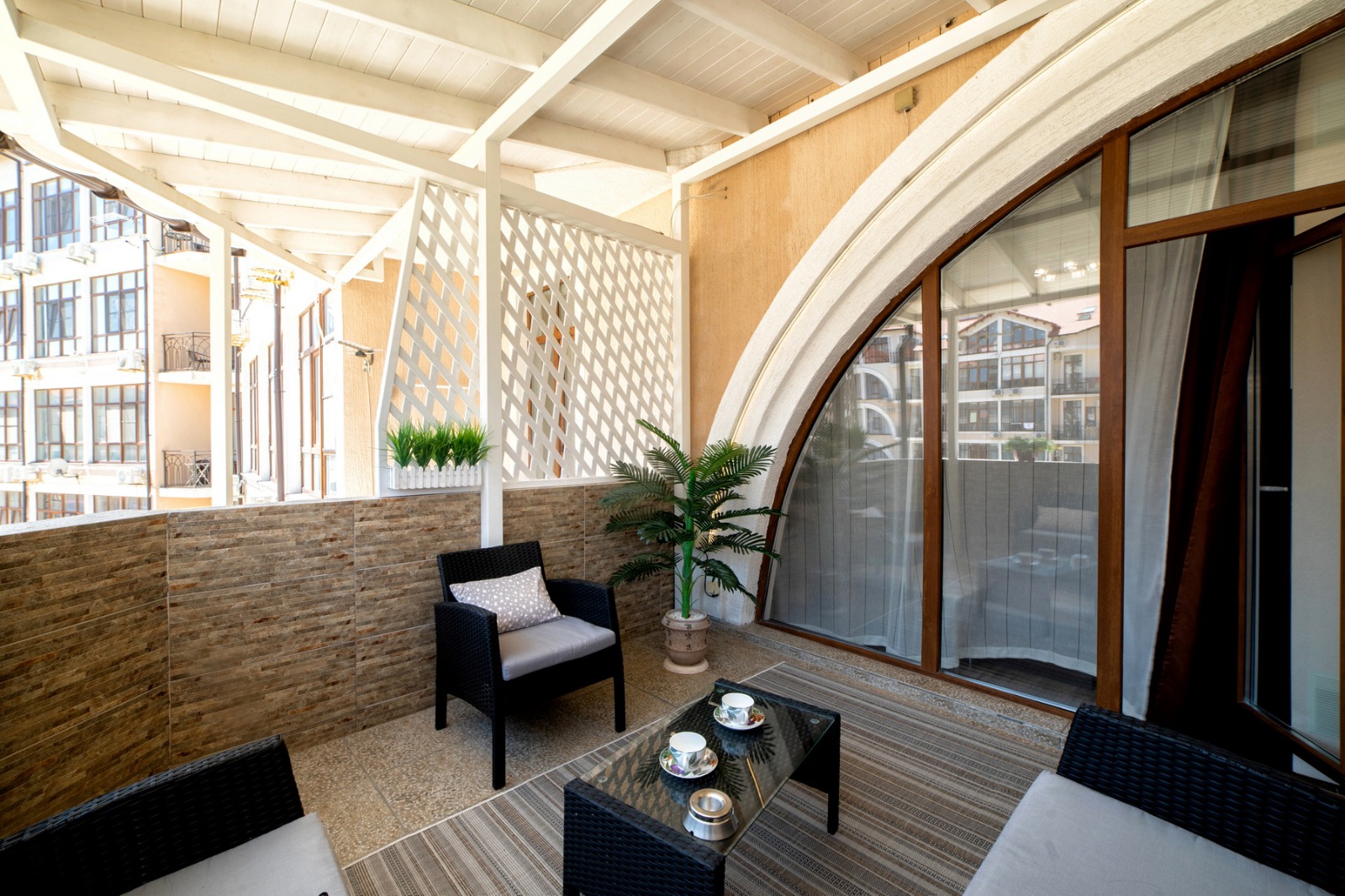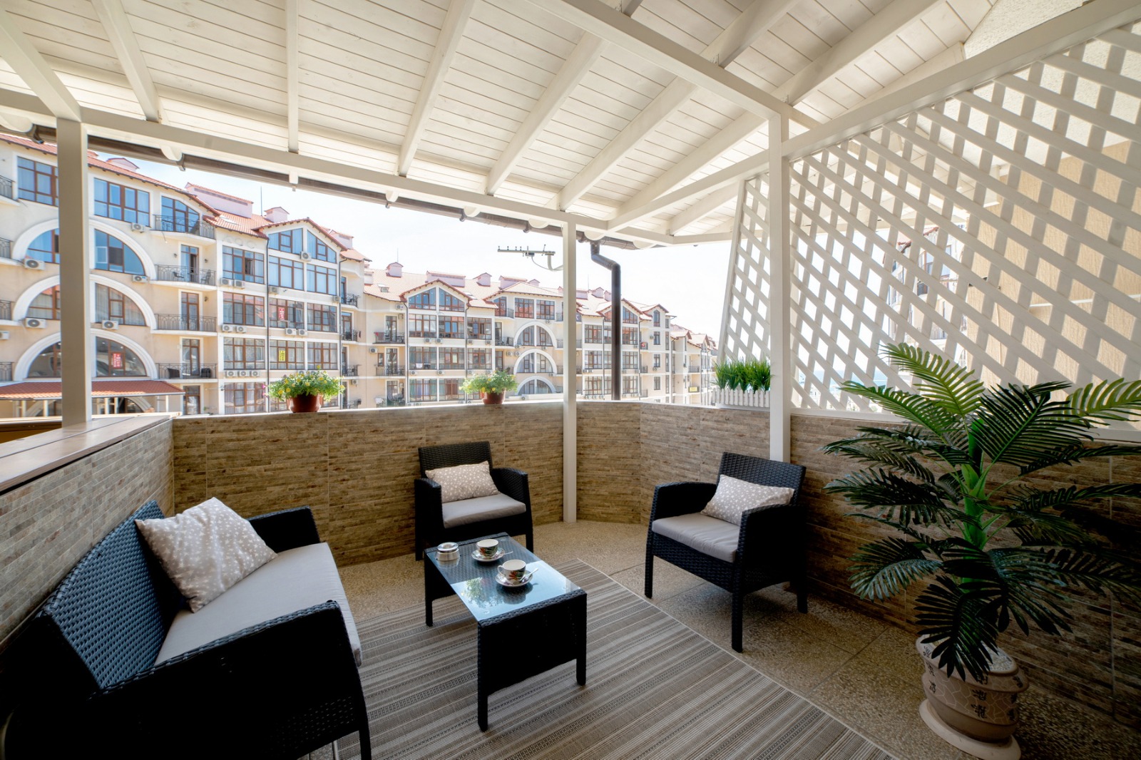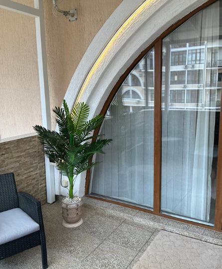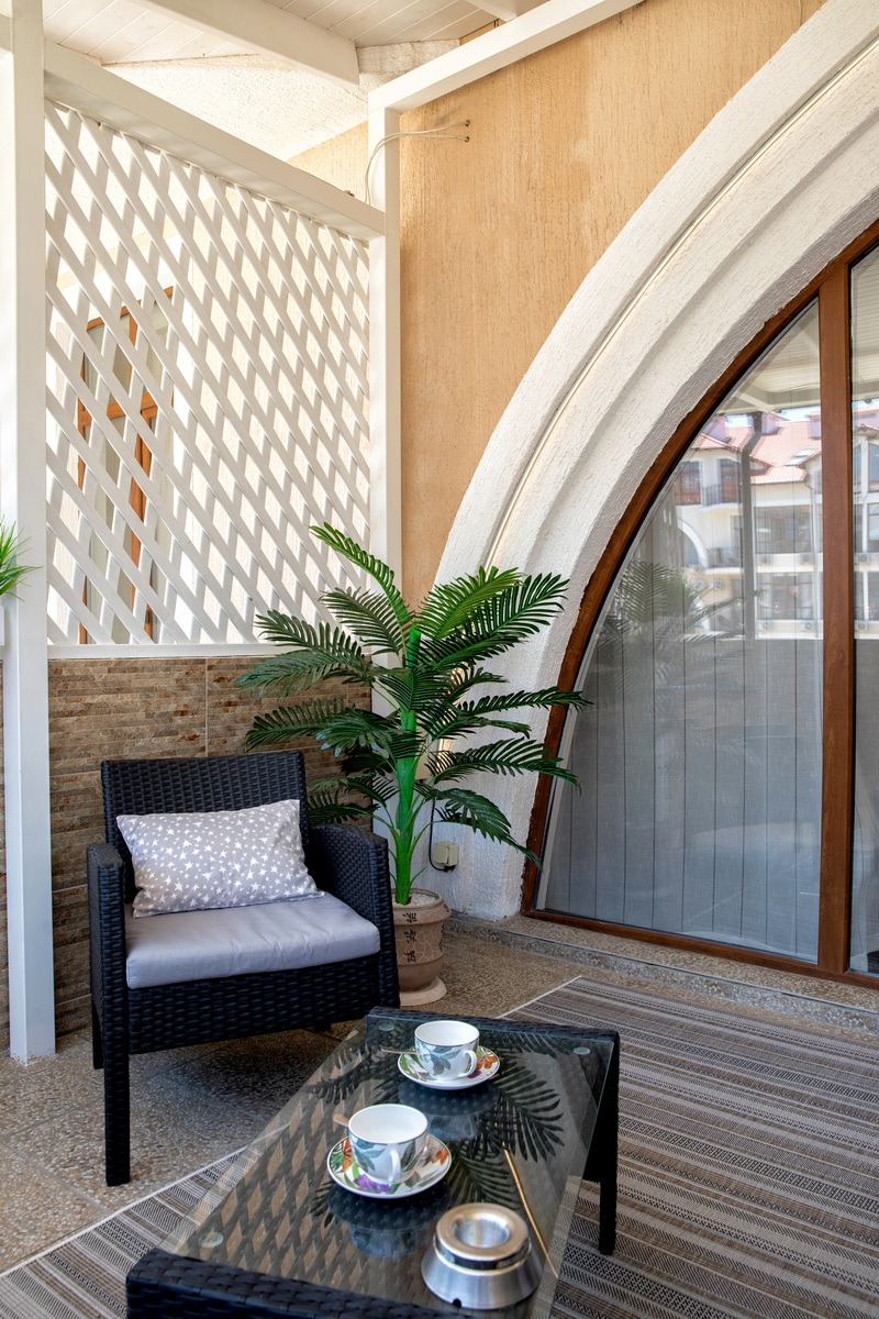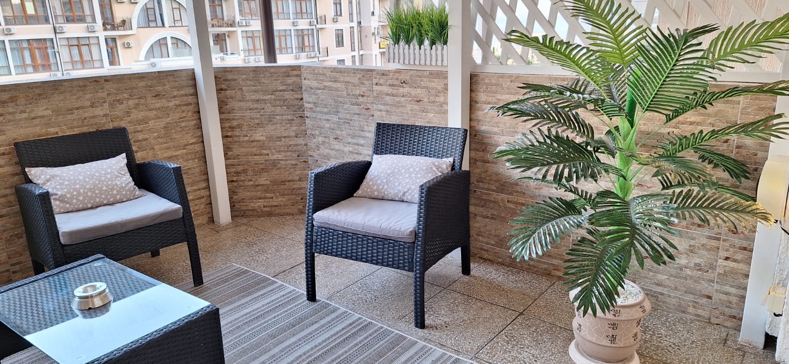 Отдельного внимания заслуживает просторная крытая терраса площадью 9 квадратных метров, обставленная стильной мебелью из ротанга. С неё открывается прямой вид на море — идеальное место для утреннего кофе, вечерних разговоров или чтения в тишине. На террасе также предусмотрена сушилка для белья, что особенно удобно при длительном проживании. Внутри апартаментов установлена сплит-система для поддержания комфортной температуры в любое время года, большой телевизор с плоским экраном диагональю 147 сантиметров и стабильный Wi-Fi.