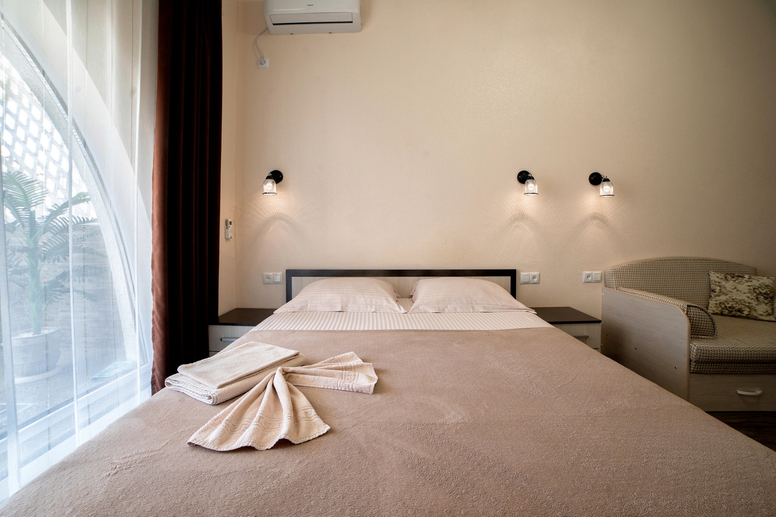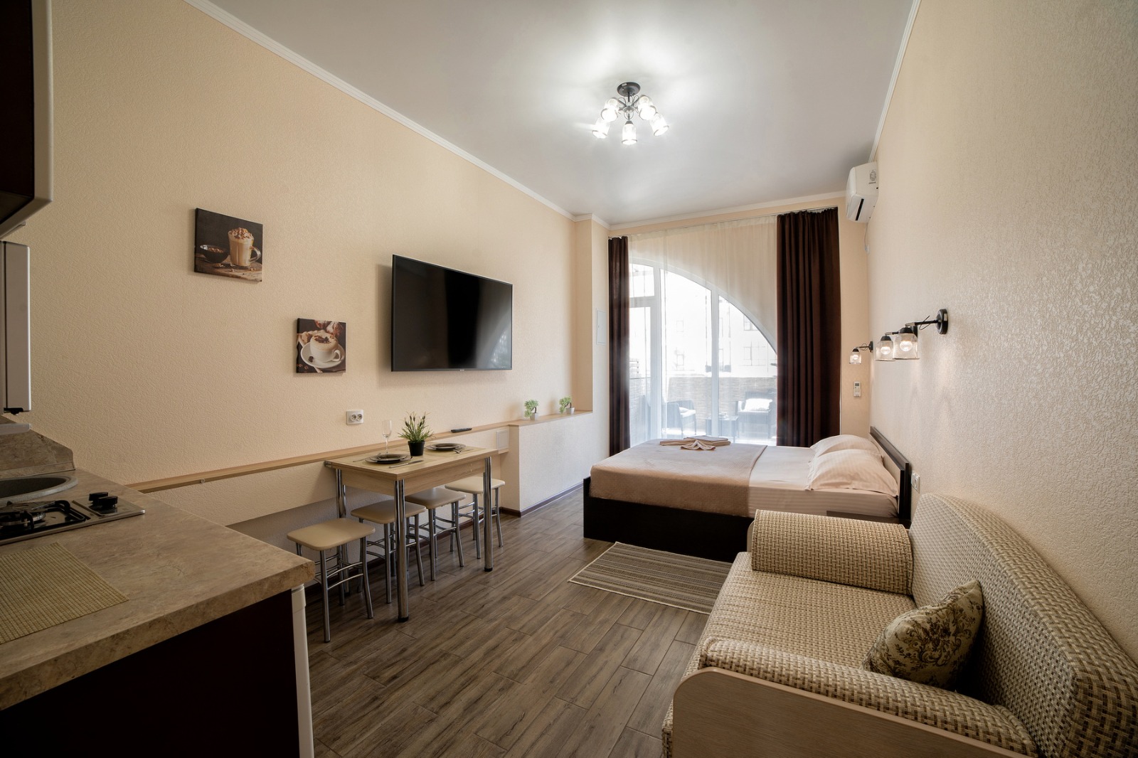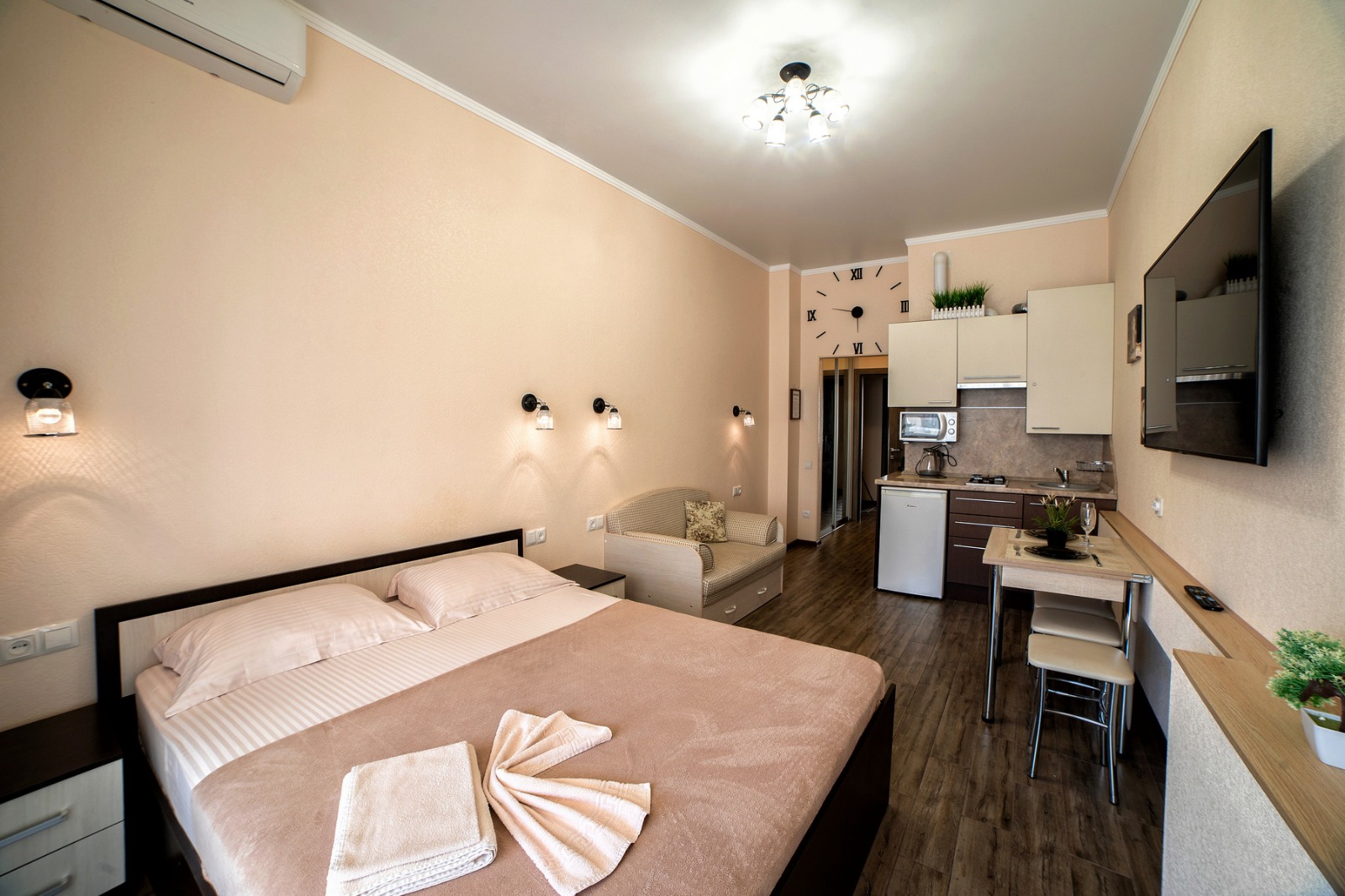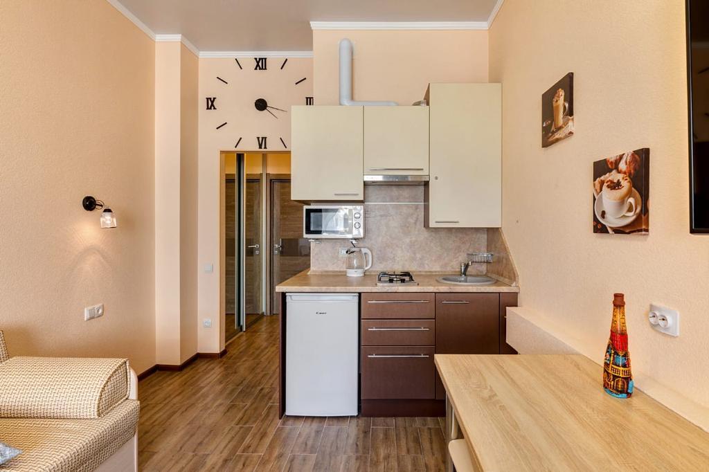 Студия площадью 27 квадратных метров находится на втором этаже, к которому ведёт удобный пассажирский лифт. Пространство рассчитано на 3–4 человек и оформлено с вниманием к деталям — здесь сочетаются функциональность, свет и современный комфорт. В гостиной установлена большая двухспальная кровать размером 160 на 200 сантиметров, а дополнительное спальное место — раскладной диван-кровать 140 на 180 сантиметров. Все зоны для сна оснащены качественным постельным бельём, обеспечивающим глубокий и отдохновительный сон после дня на пляже.