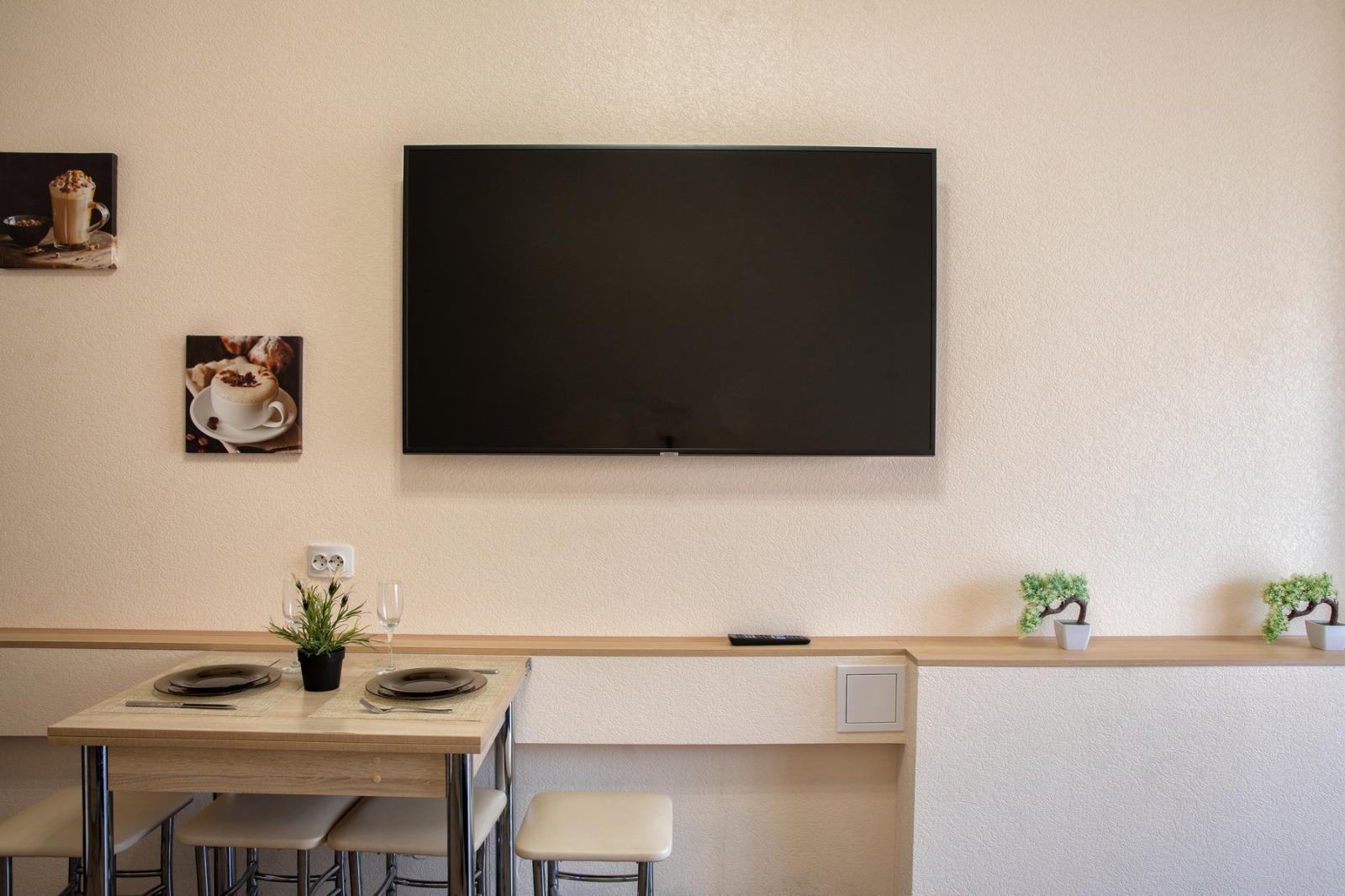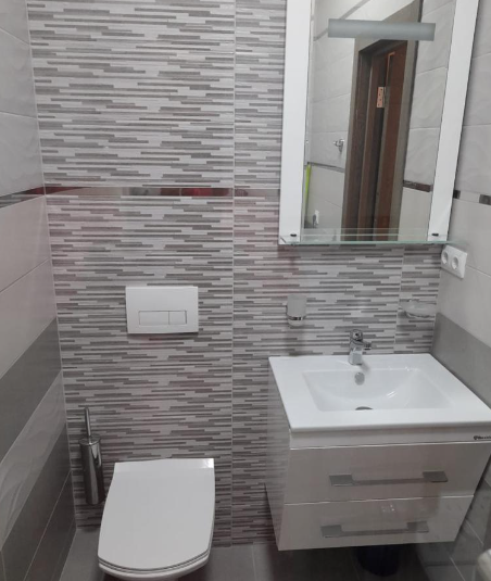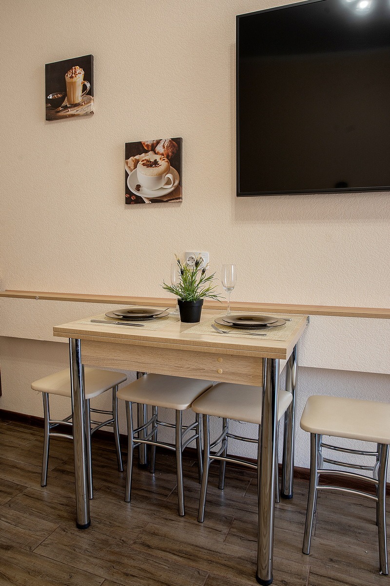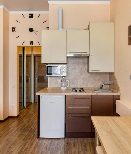 Кухня полностью укомплектована для самостоятельного приготовления еды: здесь есть газовая плита, холодильник, электрический чайник и микроволновая печь. Обеденный стол на четыре персоны и удобные стулья создают уютную атмосферу для семейных ужинов или завтраков перед выездом на экскурсию. В наличии вся необходимая посуда и столовые приборы — от кастрюль и сковородок до бокалов и сервировочных тарелок. В ванной комнате установлена современная душевая кабина, работает стиральная машина, есть фен и утюг с гладильной доской.